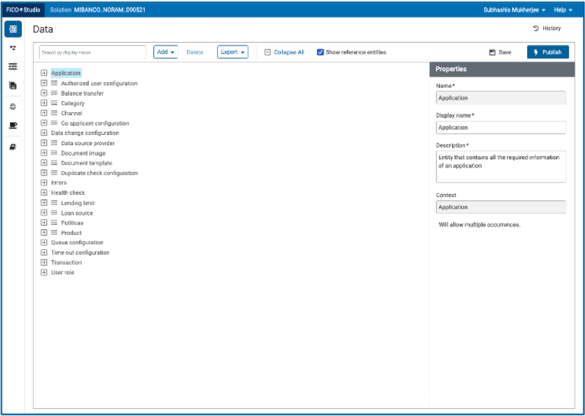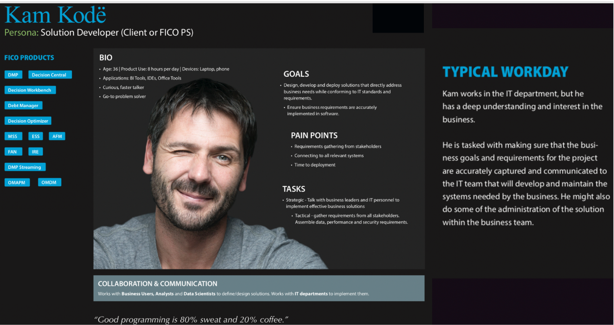 FICO Studio was the outcome of a collaborative effort by UX, Product Management, Professional services and engineering. The project started with a research project to define the target FICO personas and conduct contextual interviews with the users to determine their use of the products to complete their tasks. The research included both internal users from FICO professional services team as well as customers from the FICO Customer Council.