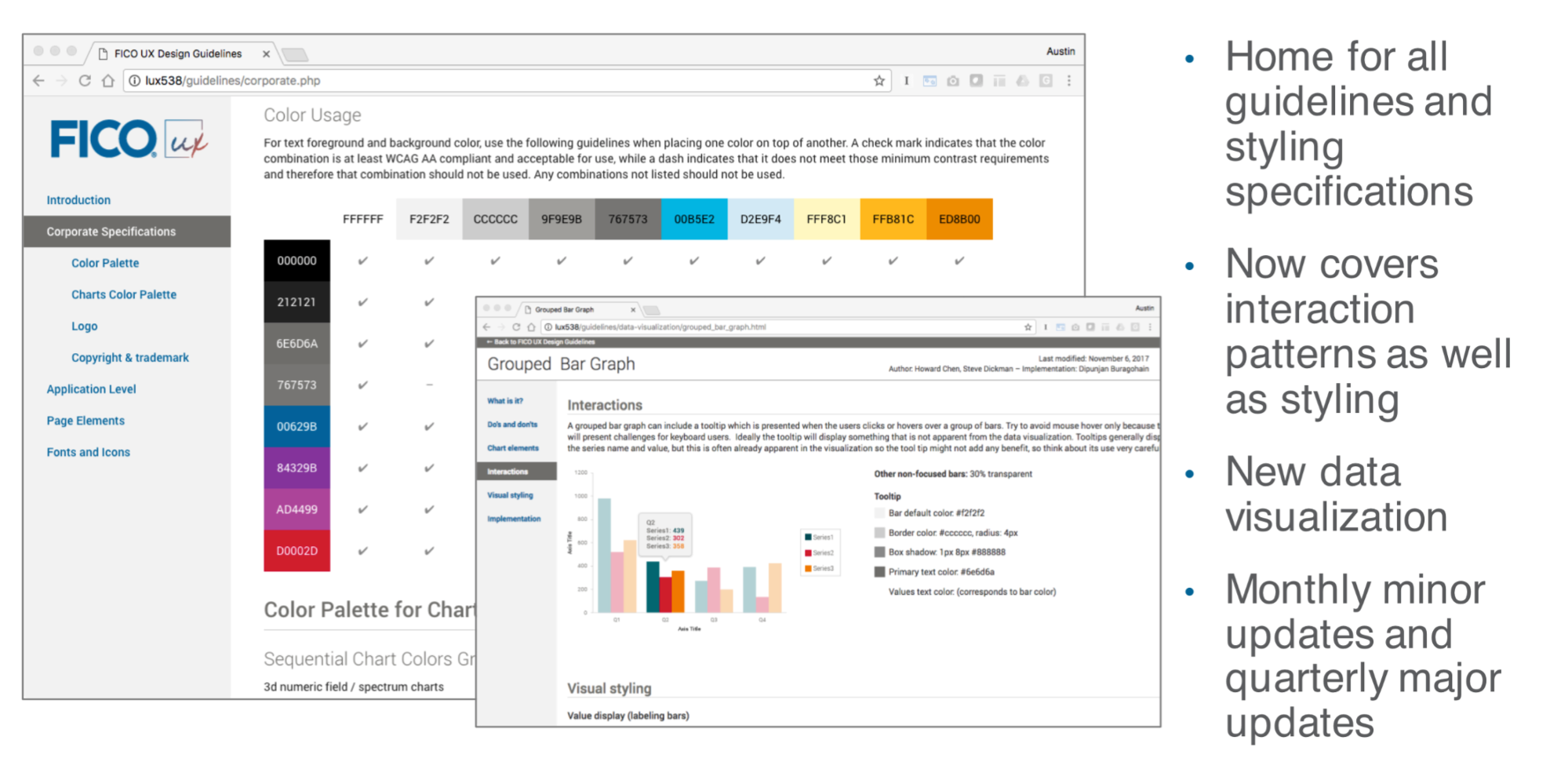 After a year of using a single style guide and moving towards single UX components (based off Material components), I decided to create a business case to create a central Design System team. The product teams had few or no front end developers that could easily create the new standard UX components. Each development team had their own code to implement the components. We needed a more efficient method of building product UX. I worked with our CTO to get the budget and headcount to hire a lead for the FICO Design System (IRIS) and 4 front end developers. The new lead came onboard in late 2019 and hired the development team. We worked with our Architect team on the platform to determine the technology to use for the design system. The team agreed that Angular was the best choice for our products and the work began. The UX team used Axure for our design tool and had already created the design system with all of the components and patterns. The UX Design system team worked with the Angular team to create the top priority 1.0 components for the first release of IRIS.